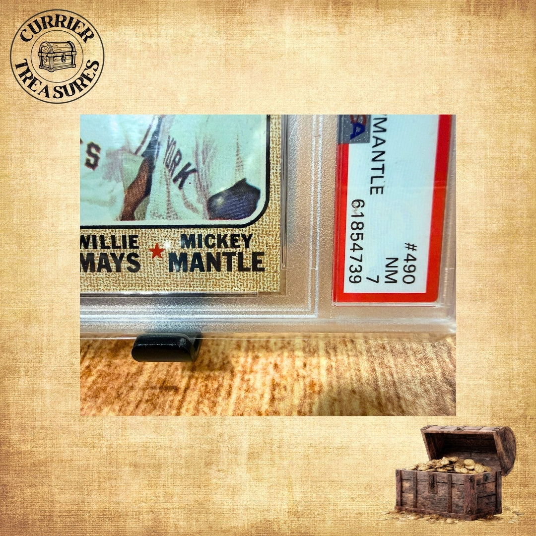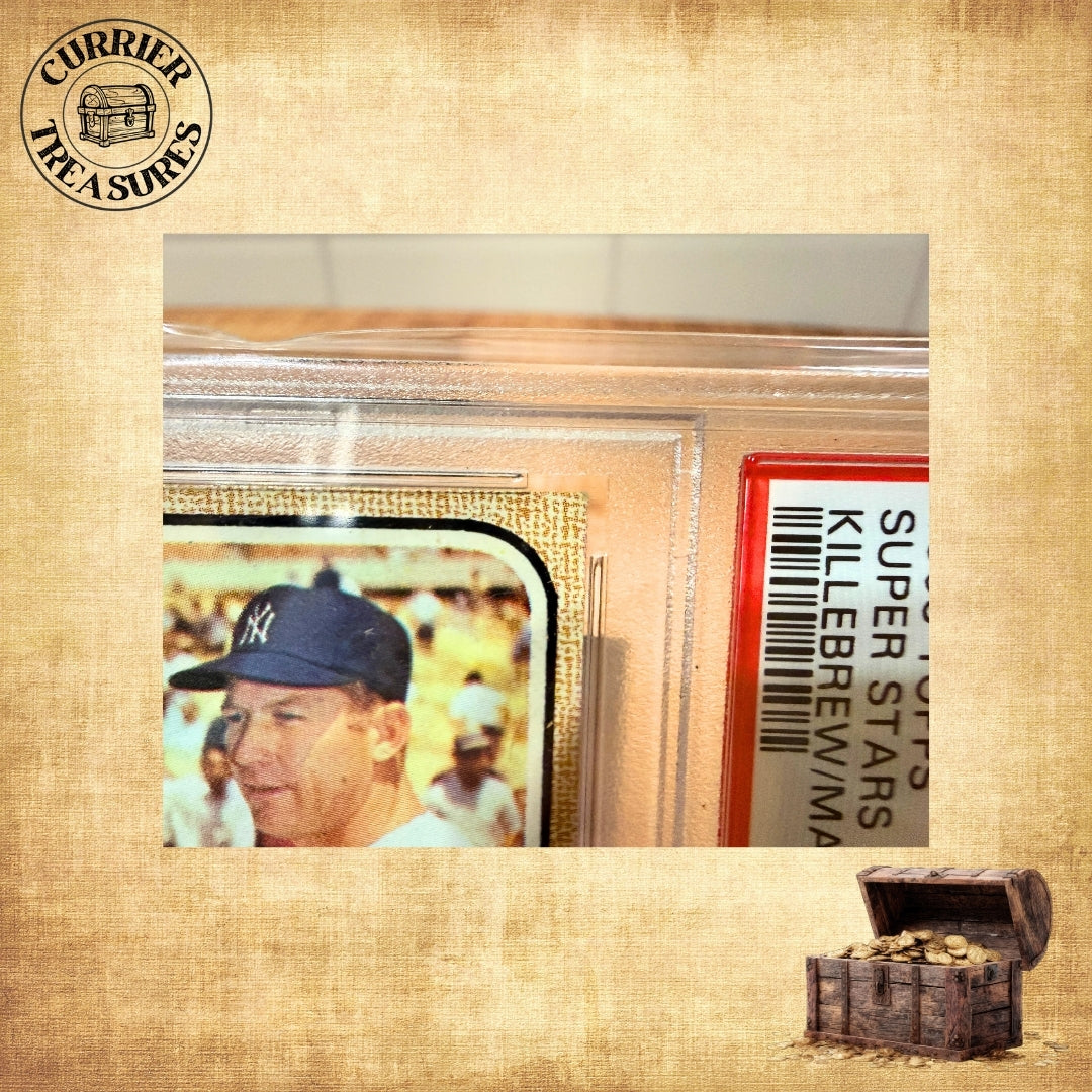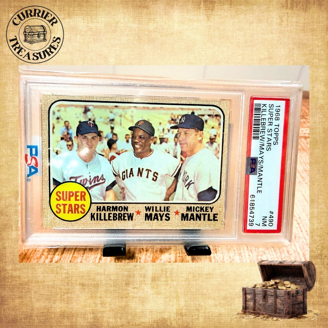 This iconic 1968 Topps Super Stars card showcases three of the greatest hitters ever to step onto a baseball diamond: Harmon Killebrew, Willie Mays, and Mickey Mantle. Graded PSA 7 (Near Mint), this slabbed vintage classic offers exceptional eye appeal with sharp color, clean borders, and strong centering for the grade.